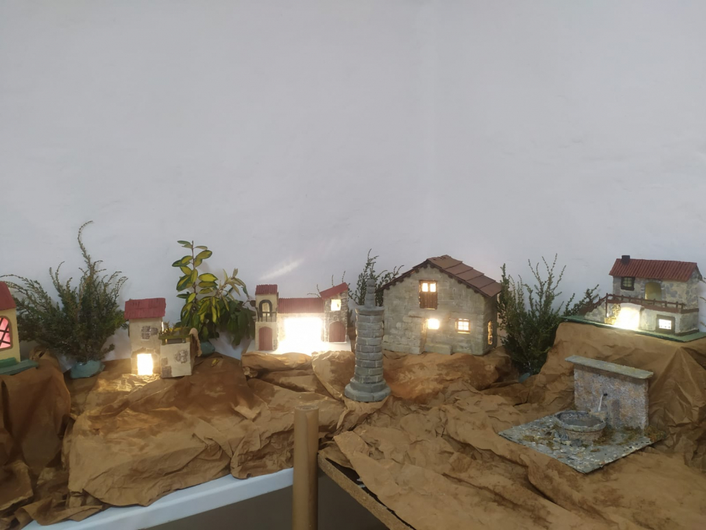 Belén tradicional cuyo origen está en un taller que llevaron a cabo hace casi treinta años las señoras del pueblo. En ese taller se prepararon y pintaron las figuras de escayola que lo componían. Ahora hemos restaurado estas imágenes y hemos ido añadiendo cada año otras piezas que lo complementan. Todas las construcciones están hechas por nosotros con elementos reciclados. Muchas de estas piezas son representaciones de edificios y otras construcciones características del pueblo, como puede ser el Rollo jurisdiccional, el ayuntamiento antiguo y la iglesia, así también el molino, el chozo y el potro de herrar.